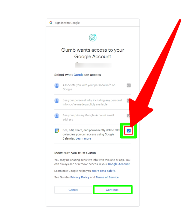 🚩 Important: After selecting your Google account, make sure to ⚠️ check the box ⚠️ to allow Gumb access.