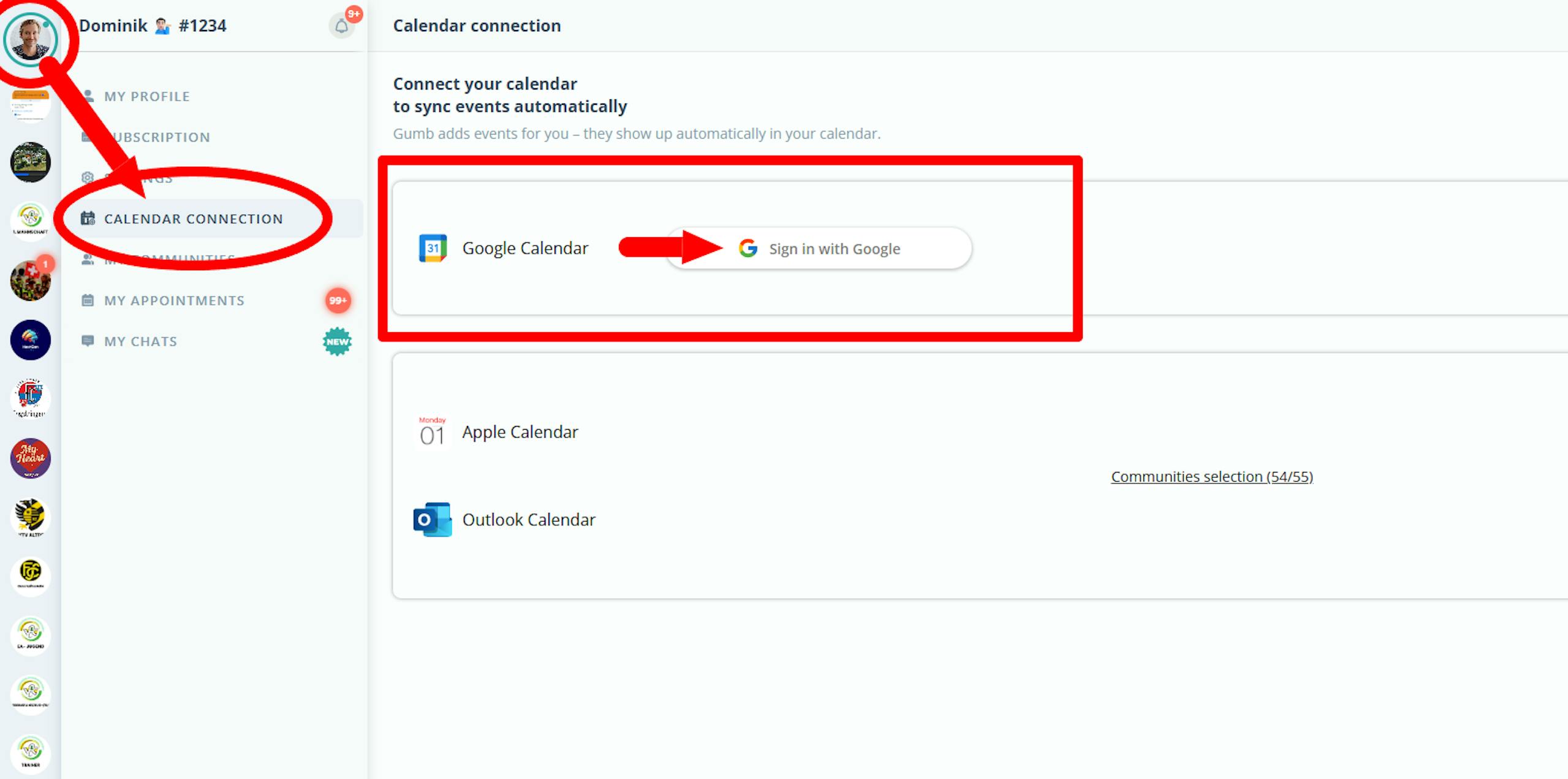 Log in once with your Google account under “Calendar Connection” in your Gumb profile and activate the sync.