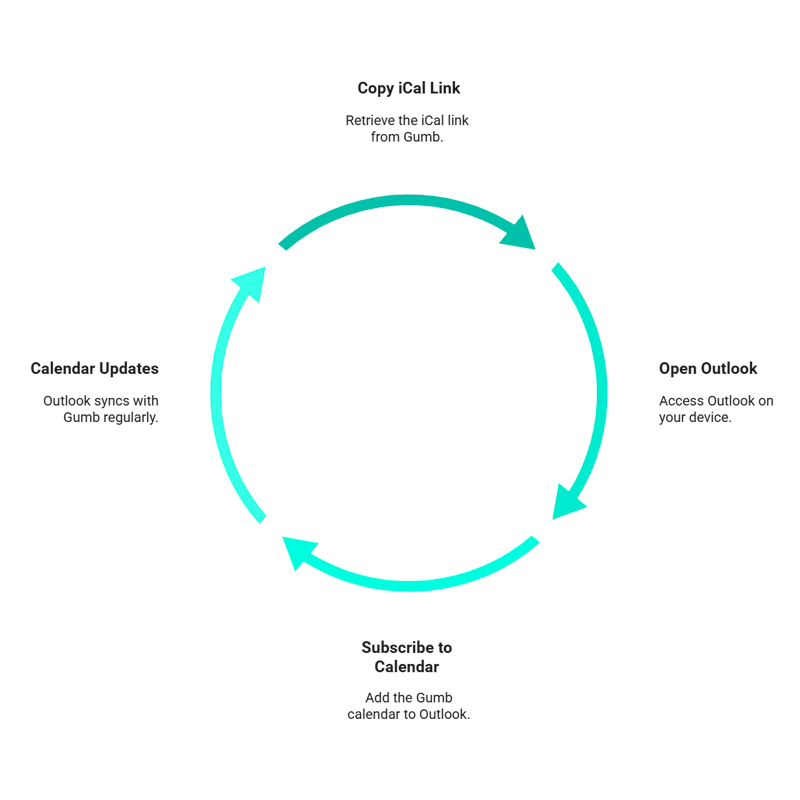 Your Gumb calendar will now update regularly in Outlook. Please note that Outlookâs sync speed can be slower compared to Google or Apple calendars.