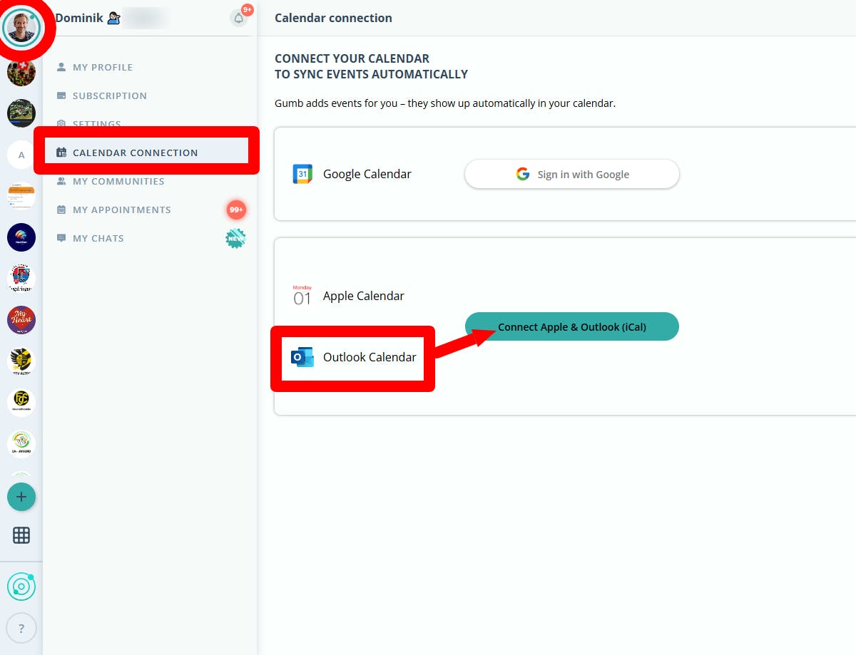 The âSubscribe Outlook Calendarâ option in Gumb is only available in the Gumb Web App (browser version). On smartphones (Android/iOS), this option is not yet displayed.