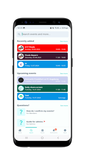 - The "Events" tab shows all your events from all groups. When you open the app, you'll see your next event right away.